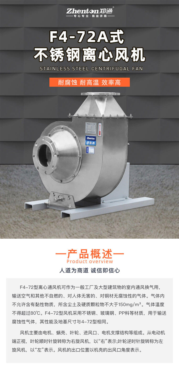 不得超過80°C。F4-72型風機采用不銹鋼、玻璃鋼、PP料等材質(zhì),用于輸送