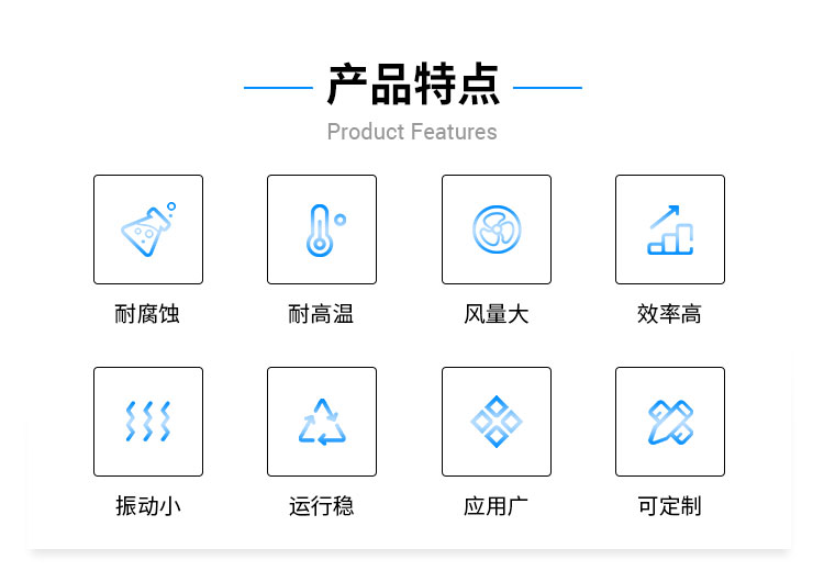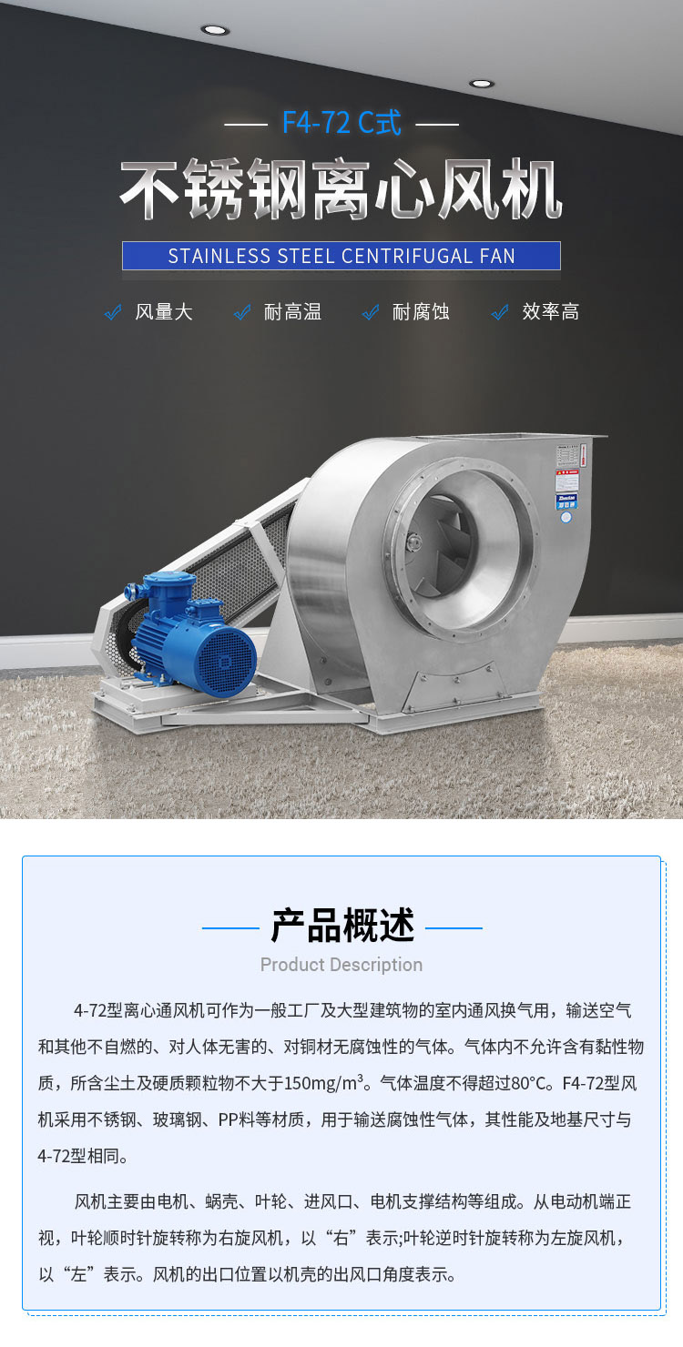 外殼及風(fēng)輪采用不銹鋼風(fēng)機(jī)材質(zhì)焊接而成,耐高溫,能有效防酸堿、防腐蝕。