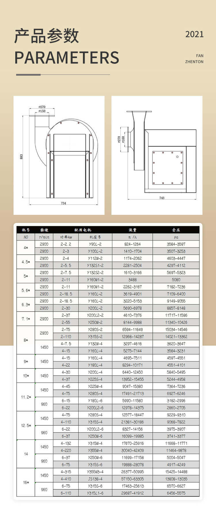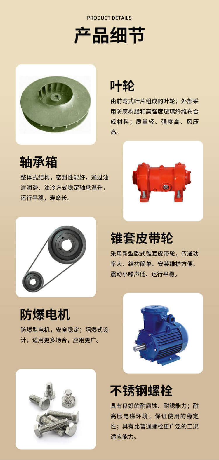 主要由玻璃鋼材質制成,大機號也可以制成皮帶驅動,耐腐蝕性好、不易老化、噪聲低、重量輕。