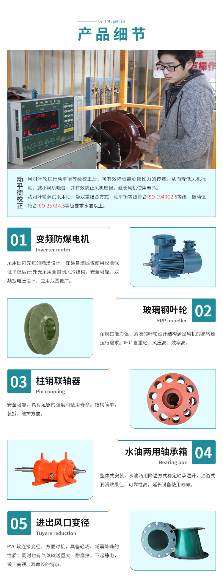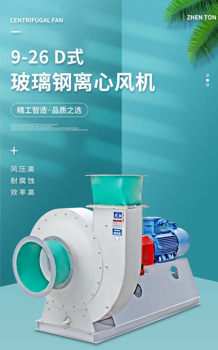 主要由玻璃鋼材質(zhì)制成,大機號也可以制成皮帶驅動,耐腐蝕性好、不易老化。噪聲低、重量輕。