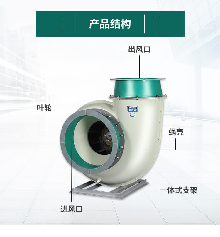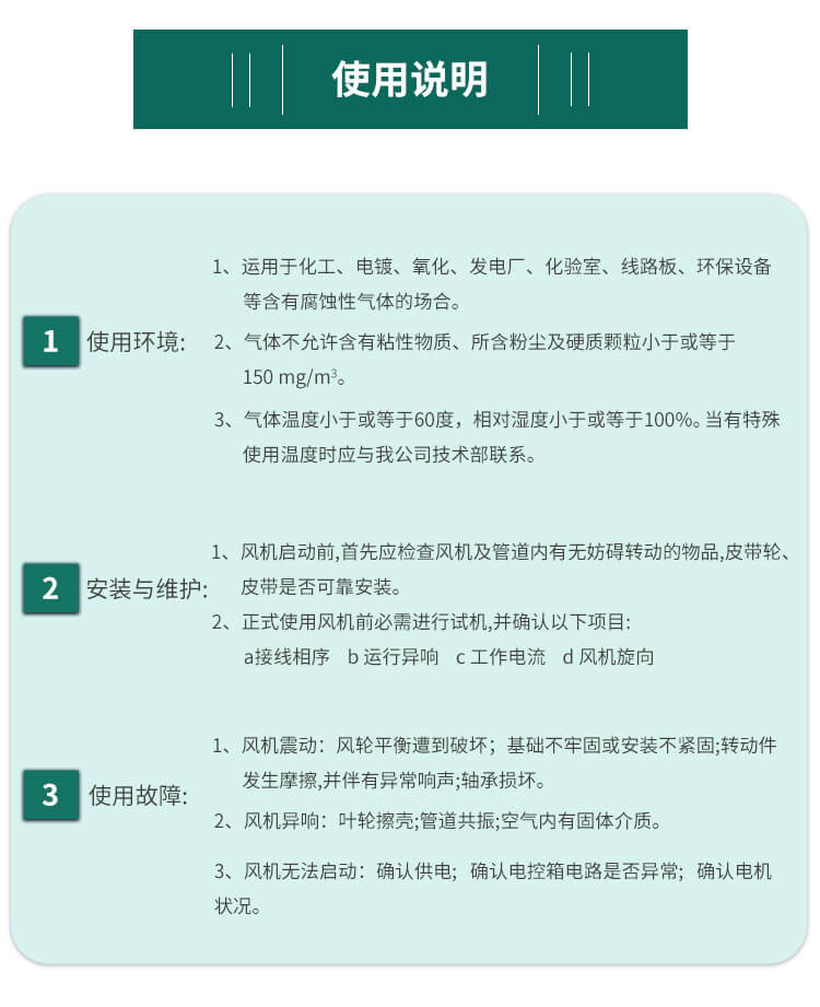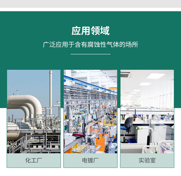 適用于化工廠、紡織、電鍍、實驗室等場所排送含有一定濃度的酸、堿、鹽等腐蝕性氣體,也可以作為一般工廠的建筑物通風換氣用