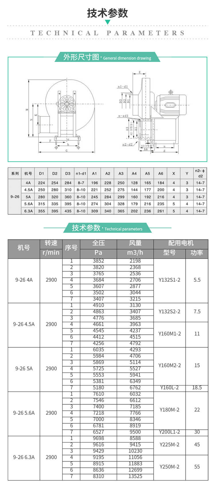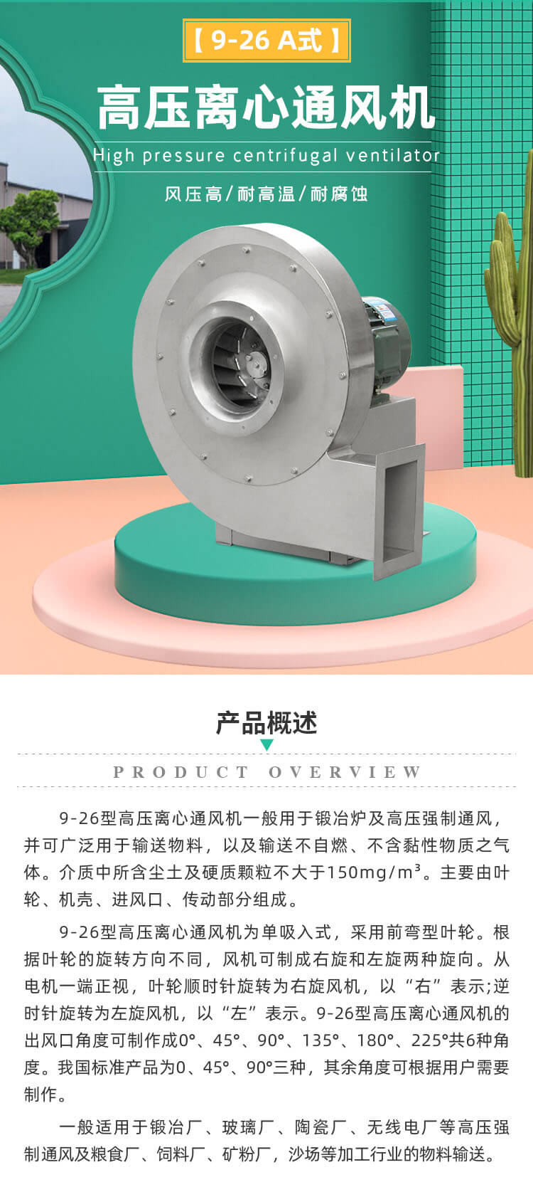9-26型高壓離心通風機一般用于鍛冶爐及高壓強制通風, 并可廣泛用于輸送物料,以及輸送不自燃、不含黏性物質之氣 體。介質中所含塵土及硬質顆粒不大于150mg/m3。主要由葉 輪、機殼、進風口、傳動部分組成。