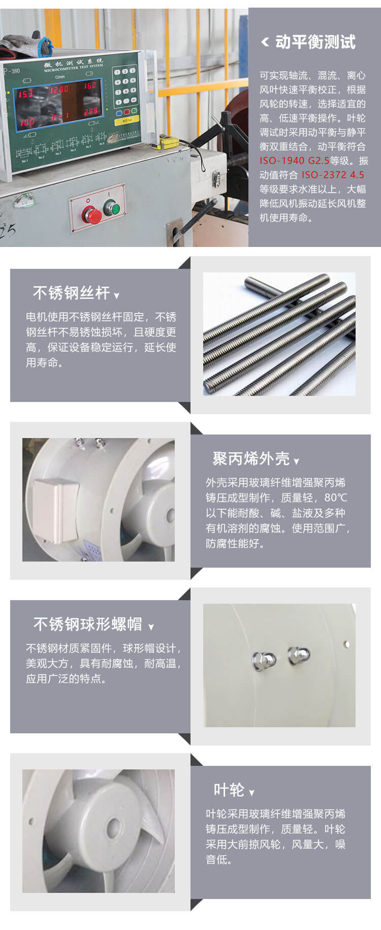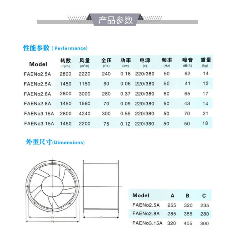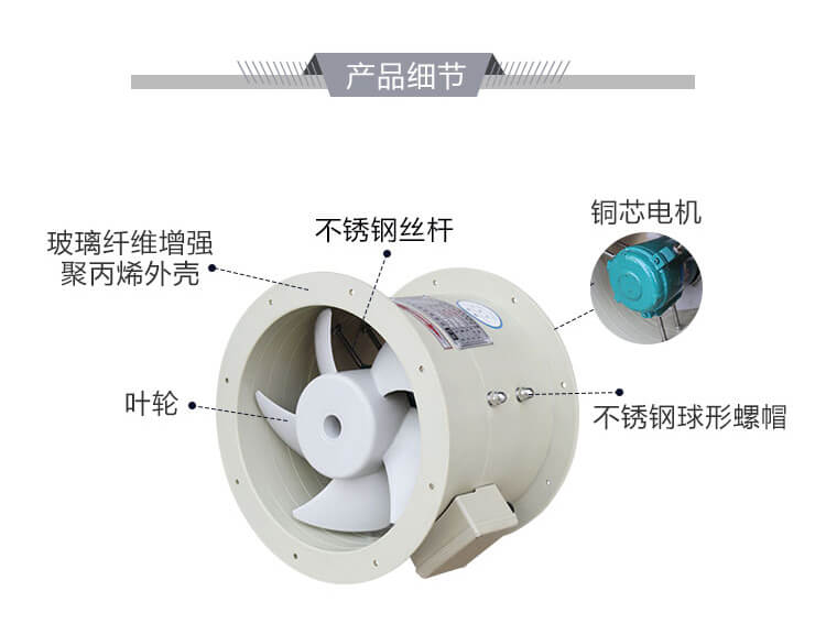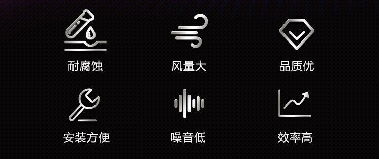 外殼及葉輪均采用聚丙烯鑄壓成型制作,大前掠風輪,風量大、噪音低;