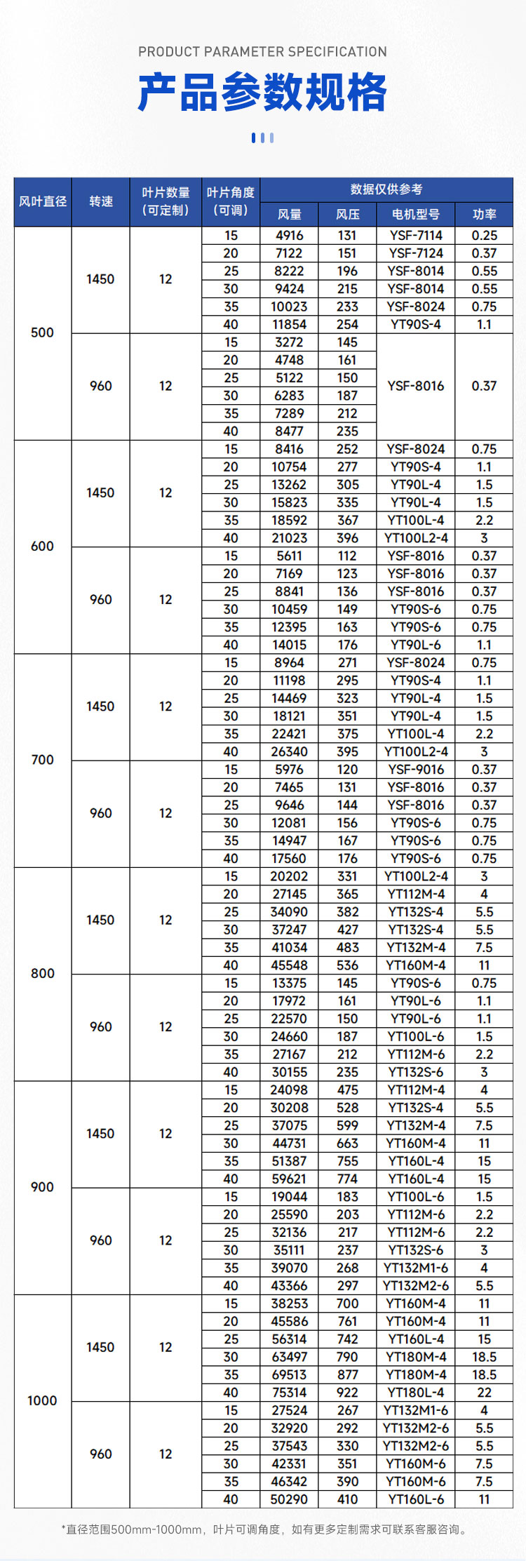 葉片安裝角度可按用戶對風(fēng)量風(fēng)壓的需求進行調(diào)整,