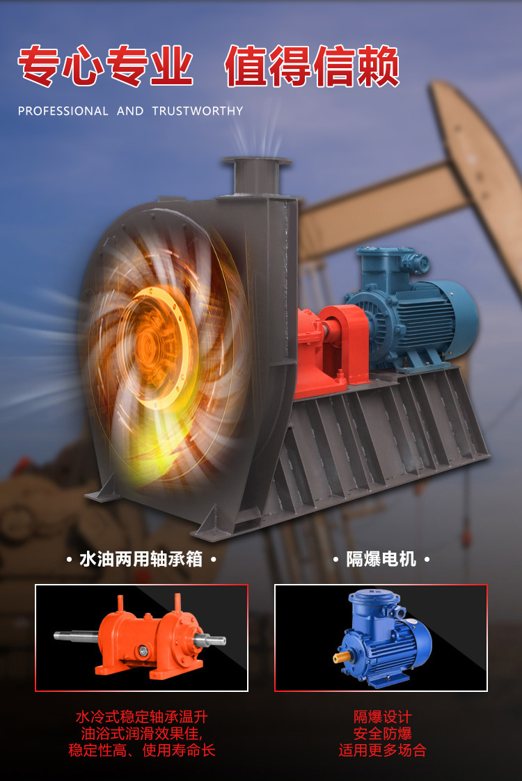 該高壓離心通風機為單吸入式,高壓小流量離心風機。適用于油田、電站、冶金、化工等行業(yè)的高壓強制送風。輸送空氣及無腐蝕性不自燃、不含黏性物質(zhì)的氣體。介質(zhì)溫度一般不超過 50°C(最高不超過80°C),介質(zhì)中所含塵土及硬質(zhì)顆粒不大于150mg/m.動平衡等級符合IS0-1940 G2.5等級,振動值符合ISO-2372 4.5等級要求水準以上。