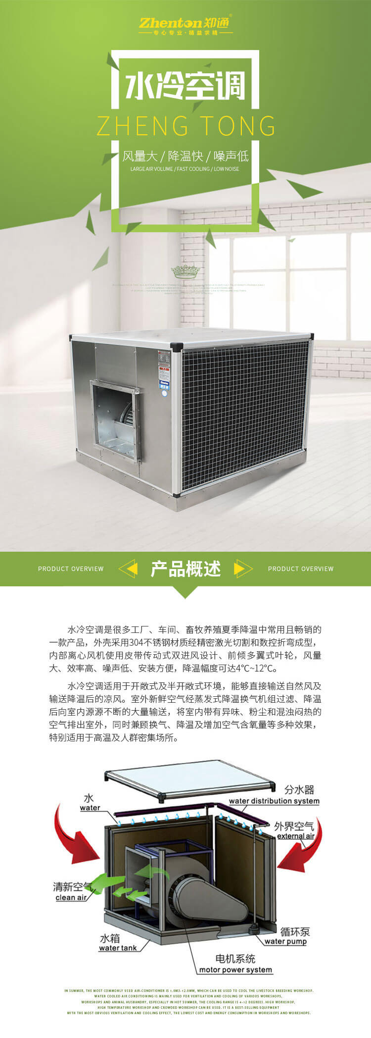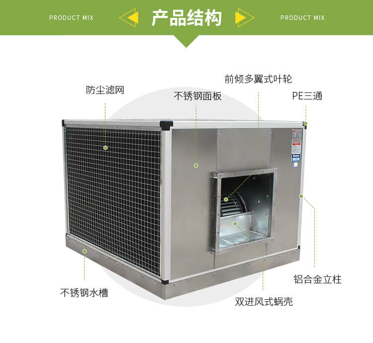 水冷空調(diào)是很多工廠、車間、畜牧養(yǎng)殖夏季降溫中常用且暢銷的一款產(chǎn)品, 外殼采用304不銹鋼材質(zhì)經(jīng)精密激光切割和數(shù)控折彎成型, 內(nèi)部離心風(fēng)機(jī)使用皮帶傳動(dòng)式雙進(jìn)風(fēng)設(shè)計(jì)、前傾多翼式葉輪,風(fēng)量大、效率高、噪聲低、安裝方便,降溫幅度可達(dá)4°C~12°C。