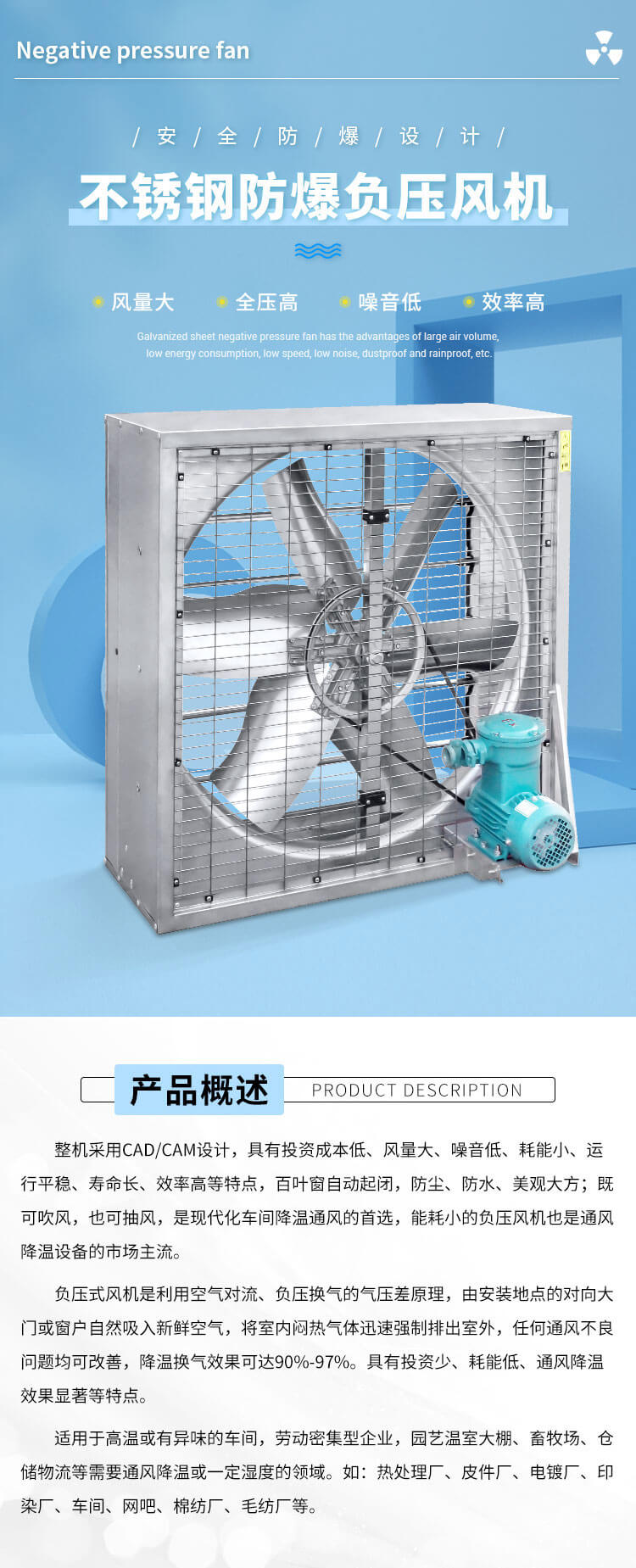整機采用CAD/CAM設計,具有投資成本低、風量大、噪音低、耗能小、運行平穩、壽命長、效率高等特點,百葉窗自動起閉,防塵、防水、美觀大方;既可吹風,也可抽風,是現代化車間降溫通風的首選,能耗小的負壓風機也是通風降溫設備的市場主流。 負壓式風機是利用空氣對流、負壓換氣的氣壓差原理,由安裝地點的對向大門或窗戶自然吸入新鮮空氣,將室內悶熱氣體迅速強制排出室外,任何通風不良問題均可改善,降溫換氣效果可達90%-97%。具有投資少、耗能低、通風降溫效果顯著等特點。