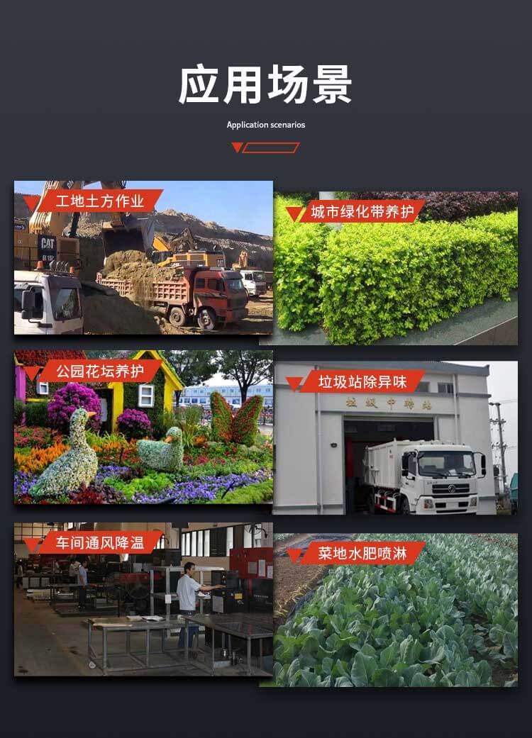 應(yīng)用于多種場合,如車間通風(fēng)降溫、植被養(yǎng)護(hù)澆水加濕、垃圾站除異味、植物作物水肥藥物噴淋等。