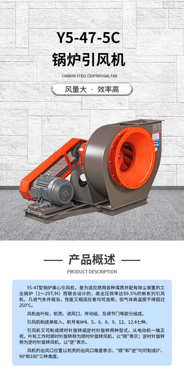 Y5-47-C鍋爐引風(fēng)機(jī),適用于燃用各種煤質(zhì)并配有消煙除塵裝置 的0.2-20t/h工業(yè)鍋爐,以為進(jìn)氣條件相當(dāng)、性能又相適應(yīng)者均可采用,但最高溫度不超過(guò)250℃。