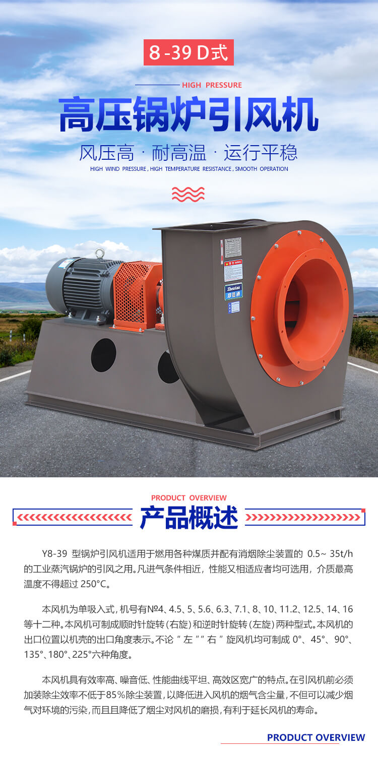 y8-39-D式離心風機屬于高溫用途的高溫離心通風機,又稱鍋爐引風機,處理氣體介質溫度不能超過280℃。風壓大,結構穩固,運行平穩。