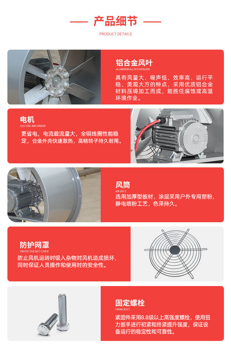 風機電機采用F級/H級絕緣,F(xiàn)級適合環(huán)境最高溫度不超過90°C(H級不超過120"C),電動機軸承采用耐高溫密封軸承軸承潤滑油滴點溫度≥230°C,防護等級IP56以上。可復位超然保護,電機運行壽命長,連續(xù)運轉超過15000小時仍能正常使用。 風機風葉為CAD優(yōu)化設計,可調節(jié)鋁合金葉片,結構合理美觀大方,采用優(yōu)質鋁合金材料壓鑄加工而成。風葉角度由流體力學專家專門設計,因此風量大、噪音小、效率高、運行穩(wěn)定。 風機采用戶外專用塑粉,靜電噴粉工藝,色澤持久。
