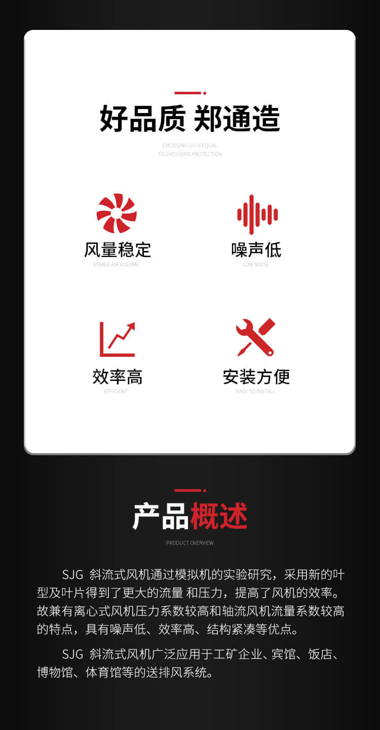 SJG斜流風機廣泛應用于工業及民用建筑等各種通風換氣場所,特別使用于通風與空調管道的加壓、送風和排風